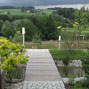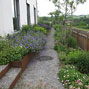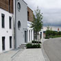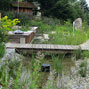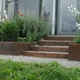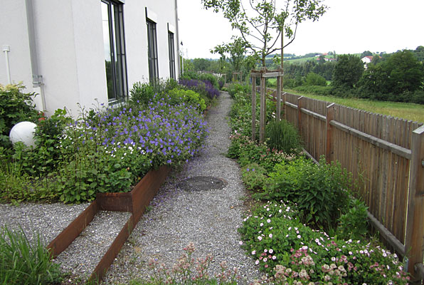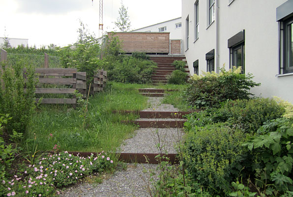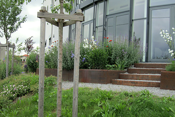 Das große Gebäude mit seinen vielfältigen Nutzungsformen stellt hohe Anforderungen an das schmale Hanggrundstück. Zur optimalen Balance zwischen Fläche und Höhe wurde zum Abfangen der Höhendifferenzen mit Cortenstahl gearbeitet.