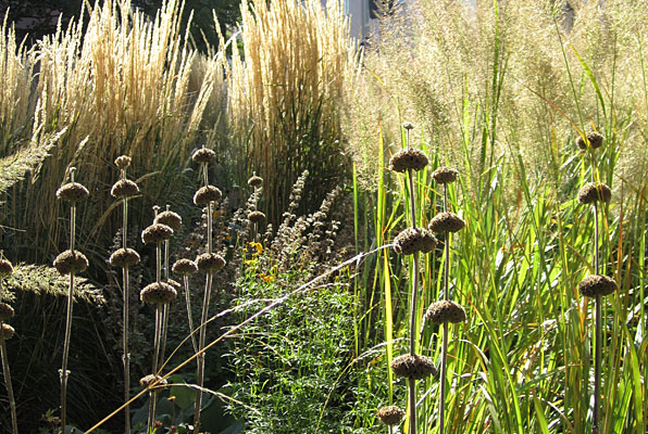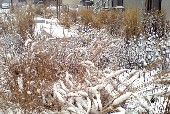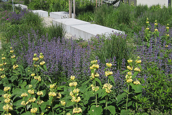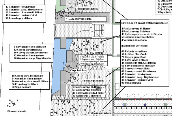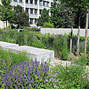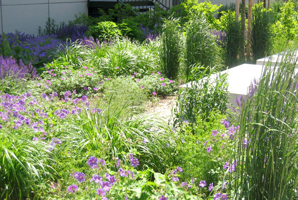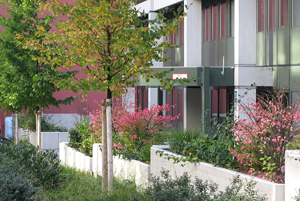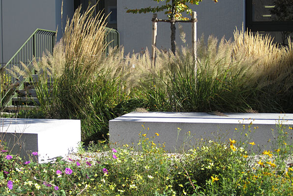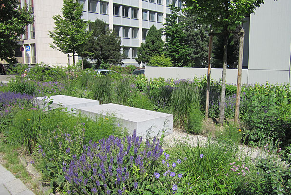 Im Rahmen von Sanierungsarbeiten im Außenbereich wurden im Jahr 2008 auch die Außenanlagen des Gebäudes in der Linprunstraße erneuert. Ziel war es, in den schmalen Grünstreifen über das Jahr möglichst viel Erlebnisqualität zu bieten. Eine vielfältige und gleichzeitig pflegeextensive Staudenpflanzung mit einem hohen Gräseranteil bildet einen ansprechenden „Farbraum“ in den ansonsten sehr steinernen Straßenräumen.